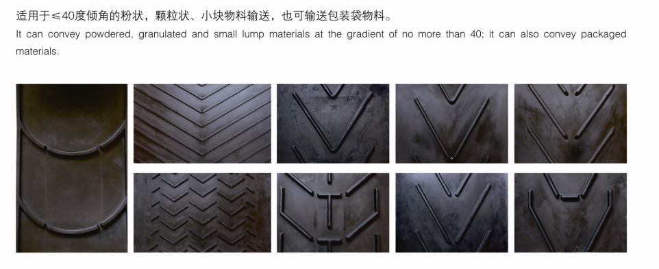 花紋輸送帶是由帶體和花紋部分組成,由于運(yùn)輸物料不同和輸送機(jī)傾角大小,要求花紋形狀和高低深淺也不同。適用于輸送傾角≤40度的粉狀、顆粒狀、小塊物料,也可輸送包裝袋物料。